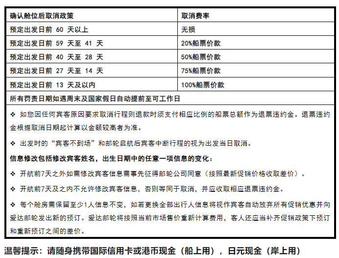 1)若遇不可抗拒因素(如:遇臺風等),郵輪公司有權(quán)改變行程及縮短港口停留時間,由此所產(chǎn)生的損失我司及郵輪公司概不負責。